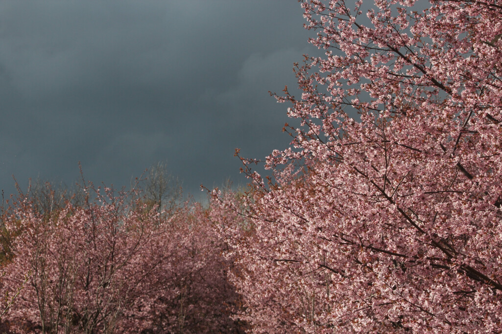 - 13.5.2022 Prunus accoladen kukinta ja tummanpuhuvat pilvet
